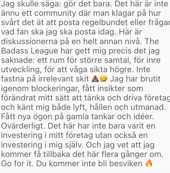 The Badass League Ă€r inte bara en mastermind â det Ă€r din katalysator för att skapa lĂ„ngsiktig framgĂ„ng i din business. Under 6 mĂ„nader fĂ„r du strategisk vĂ€gledning, nĂ€tverkande med likasinnade driva soloprenörer och praktiska verktyg som tar din business frĂ„n âvad fan ska jag göra nuâ till att ha en tydligare roadmap & trygghet i dig sjĂ€lv som soloprenör. HĂ€r fĂ„r du supporten för att fullfölja ditt mĂ„l om att vĂ€xa din business och samtidigt mĂ„ bra i den.